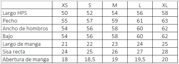 LAS MEDIDAS INDICADAS EN ESTA GUÍA SON APROXIMADAS Y PUEDEN VARIAR LIGERAMENTE DEBIDO A LA FABRICACIÓN, EL TIPO DE TELA Y EL LAVADO. LAS MISMAS CORRESPONDEN A LAS DIMENSIONES EN CENTÍMETROS TOMADAS DIRECTAMENTE SOBRE LA PRENDA (MEDIDAS PLANAS O CONTORNOS SEGÚN SE INDICA). RECOMENDAMOS TOMAR LAS MEDIDAS DE UNA PRENDA SIMILAR QUE TE QUEDE BIEN Y COMPARARLAS CON ESTA TABLA PARA ELEGIR EL TALLE MÁS ADECUADO. LA ELECCIÓN DEL TALLE FINAL DEPENDERÁ DE TU PREFERENCIA EN EL AJUSTE (MÁS AJUSTADO O MÁS HOLGADO). ESTA GUÍA NO GARANTIZA UN AJUSTE PERFECTO, SINO QUE SIRVE COMO REFERENCIA PARA FACILITAR TU ELECCIÓN.