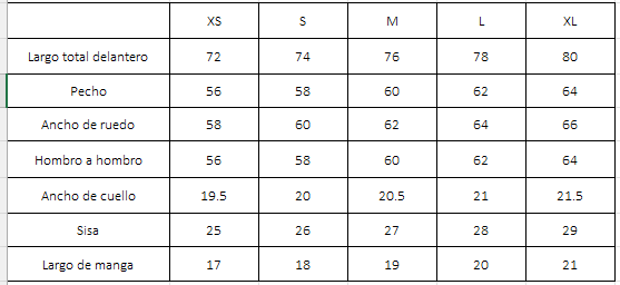 LAS MEDIDAS INDICADAS EN ESTA GUÍA SON APROXIMADAS Y PUEDEN VARIAR LIGERAMENTE DEBIDO A LA FABRICACIÓN, EL TIPO DE TELA Y EL LAVADO. LAS MISMAS CORRESPONDEN A LAS DIMENSIONES EN CENTÍMETROS TOMADAS DIRECTAMENTE SOBRE LA PRENDA (MEDIDAS PLANAS O CONTORNOS SEGÚN SE INDICA). RECOMENDAMOS TOMAR LAS MEDIDAS DE UNA PRENDA SIMILAR QUE TE QUEDE BIEN Y COMPARARLAS CON ESTA TABLA PARA ELEGIR EL TALLE MÁS ADECUADO. LA ELECCIÓN DEL TALLE FINAL DEPENDERÁ DE TU PREFERENCIA EN EL AJUSTE (MÁS AJUSTADO O MÁS HOLGADO). ESTA GUÍA NO GARANTIZA UN AJUSTE PERFECTO, SINO QUE SIRVE COMO REFERENCIA PARA FACILITAR TU ELECCIÓN.